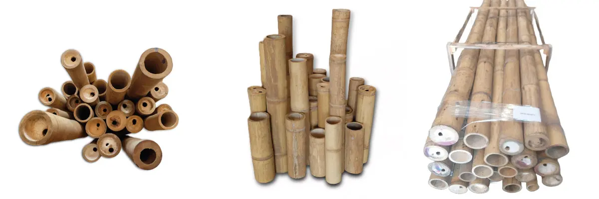 Cañas de bambú de 2-15 cm, largos hasta 8m, rollos de bambú, tableros laminados, pavimentos, revestimientos.